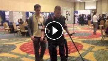 Shane Mosko, of Connecticut, was a soccer player in college before he was paralyzed from the waist down in a car accident a year and a half ago. At a recent conference of the National Neurotrauma Society in San Francisco, the 22-year-old used an exoskeleton with the aid of crutches to 'walk'.
