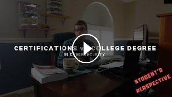 College Degrees direct their attention on getting a student aware of the various domains of "cybersecurity" all while implementing the fundamentals. You will not see many college degrees which have a student specialize in a particular area of focus (possibly network security, application security, or security management as niches, but nothing too specific). In addition, college degrees demonstrate how you are able to go through a prolonged process (typically 4 years for an undergraduate Bachelor's of Science Degree). Employers like to see individuals who are able to have a college degree as a means of a "filter."