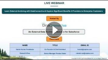In this webinar, we discussed how multiple external storage platforms (AWS, Heroku, Google, etc.) and databases (Postgres, Redshift, SQL, etc.) can be integrated with Salesforce to implement a strategic data archiving process using DataArchiva's extended version DataConnectiva.