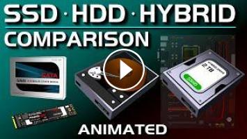 This is an animated video explaining the difference between an SSD (solid state drive), HDD (hard drive), and SSHD (hybrid drive).